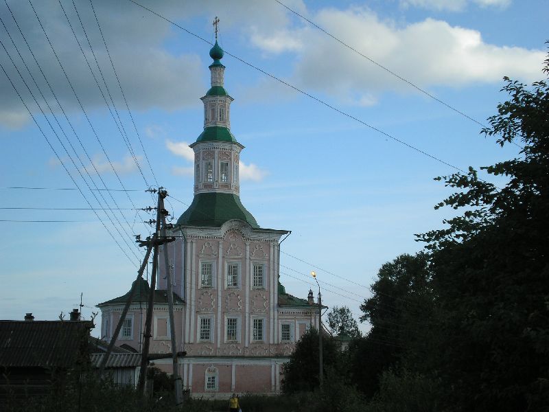 Опять на трассе. Вечерний автобус районный на Тотьму. Пустой, в Тотьму привозит лишь одного меня. Тотьма наиболе удаленная точка от Вологды моего паломничества – 300 км. Расположена на Сухоне, здесь Сухона мощная и судоходная. В Сухону впадают слева две речки – Котва и Песья Деньга. В Междуречье их находится огромный Феодосиево-Суморинский мо-настырь. Сейчас наполовину разрушенный, использующийся чисто в хозяйственных целях. Церкви города имеют специфическую архитектуру – тотемское барокко – они многокупольные, изящные, устремленные вверх, как свечи. Тотьма образовалась как место солеварения. Вьезд в город со стороны Варниц – места, где и был (и есть) соляной промысел. В городе соблюдается старинный уклад – кругом деревянные тротуары, что очень удобно, идти по ним одно удоволь-ствие. С поселение проблемы, вроде и недорого – 300 руб, но селить не хотят из-за украин-ского паспорта В Тотьме, такой немалой, всего один действующий храм в центре – Рождества Христова, в нем то и почивают мощи прп. Феодосия Тотемского. Рядом величественный храм Входа Господня во Иерусалим, тотемской архитектуры. Там "музей мореходов", советский атавизм… Меня напра-вили в "монастырские келлии", оказалось в Суморин монастырь, захланная гостиничка. Там се-люсь без проблем, именно в келлии! Сам Суморин монастырь сильно пострадал. В советское время здесь был лесотехнический техникум, курсанты таранили величественную колокольню монастыря тракторами и разрушили е… 10.07. Пятница. Утро начинается с похода в Варницы (2.5 км) к Воскресенской церкви. Там захоронен один из тотемский святых блаженный Максим иерей Тотемский. Церковь в то-темском стиле, издали не видно, что она изнутри взорвана и разрушена… Внутри полное запус-тение. У алтаря – захоронение, полуоткрыто, наверняка блж Максима, хотя мозаичную икону и место его поклонения учреждено на улице, единственно ухоженное место в этой обители… Центр – два собора – Входа Господня во Иерусалим (музей) и Рождества Христова. В последнем мощи прп Феодосия Суморина Тотемского. Спорю с женщинами – их священник (у которого мне возможно было бы останавливаться) требует 9-ти дневного поста перед причасти-ем! Ссылается на Деяния Апостолов. Кажется, я знаю это место – посещение апостолом Пет-ром семьи Корнилия Сотника. Правда, там сказано "четвертого дня постился я до нынешнего часа…" ну не 9 дней явно! Я им попытался втолковать притчу Сисоя Великого, откуда, собст-венно и берутся три дня В Тотьме посещаю Троицкий собор, тоже в местном стиле на т. наз. Зеленой Слободе, уже на Сухоне. К нему несколько сот метровая деревянная дорожка по мосткам, полная экзоти-ка. Характерны приусадебные растения в палисадах – много местного колокольчика с очень крупными цветками, встречается "краснокнижная" лилия – маслянка. Все из леса! Ниже по Су-хоне – Успенская церковь, там нынче музей старины, старинные иконы, стоит посмотреть, Тотьма все же. Можно забраться на колокольню, кругозорка Тотьмы. У стены - памятный знак захоронения третьего тотемского святого блаженного Андрея Тотемского. На сем покидаю Тотьму, иду в "келлии" за рюкзаком и на автостанцию. в 12.00 уезжаю на Вологду.
